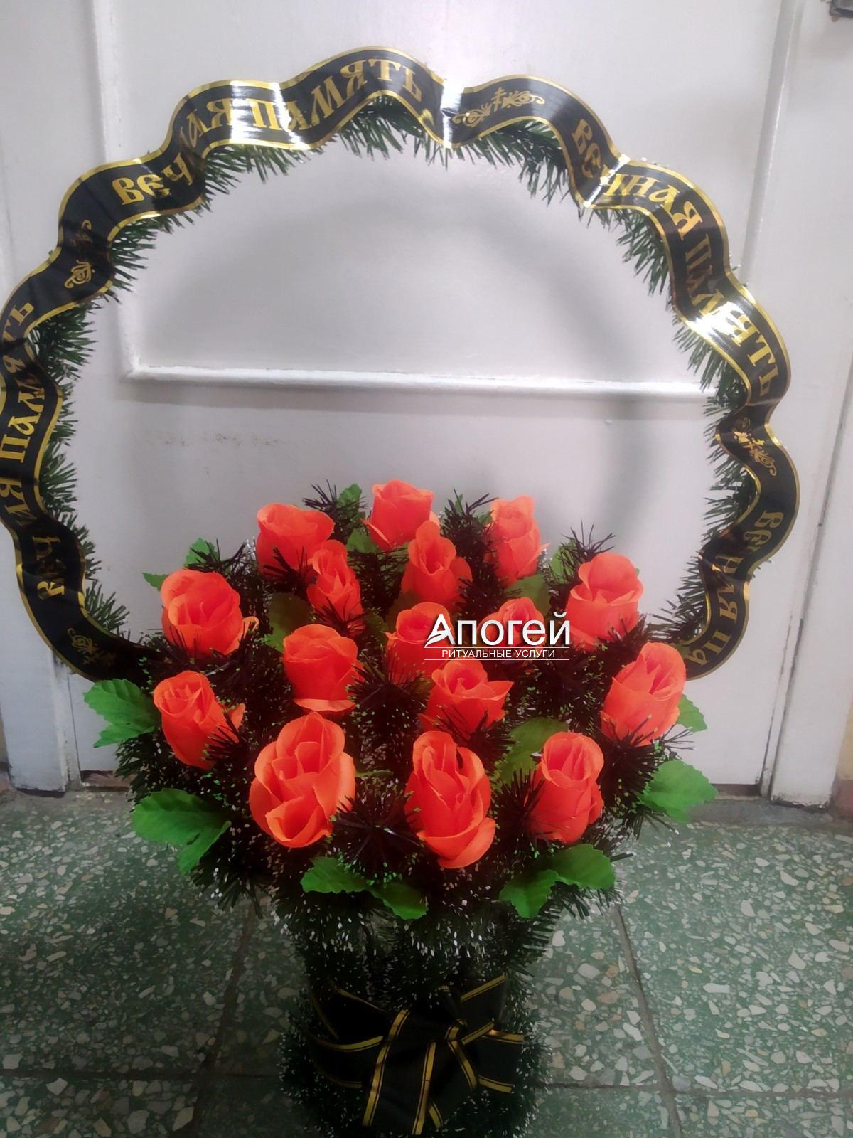 Корзина — полянка высокая с яркими бутонами и зелень, лента вечная память, высота 70см, ширина 50см