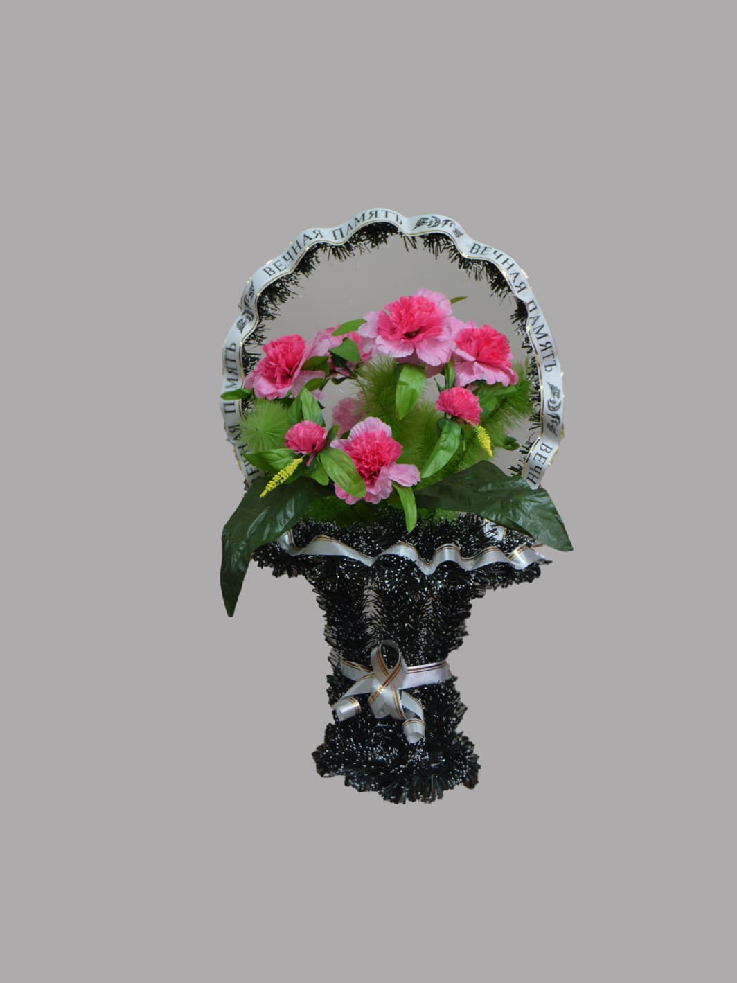 Яркая корзина с распущеными розами с зеленью, лента вечная память. Высота 85 см, ширина 60см