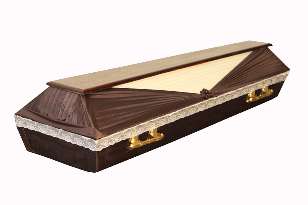 Гроб среднего класса, верхняя часть выполнена с лакированной вставкой, остальная часть задрапирована.