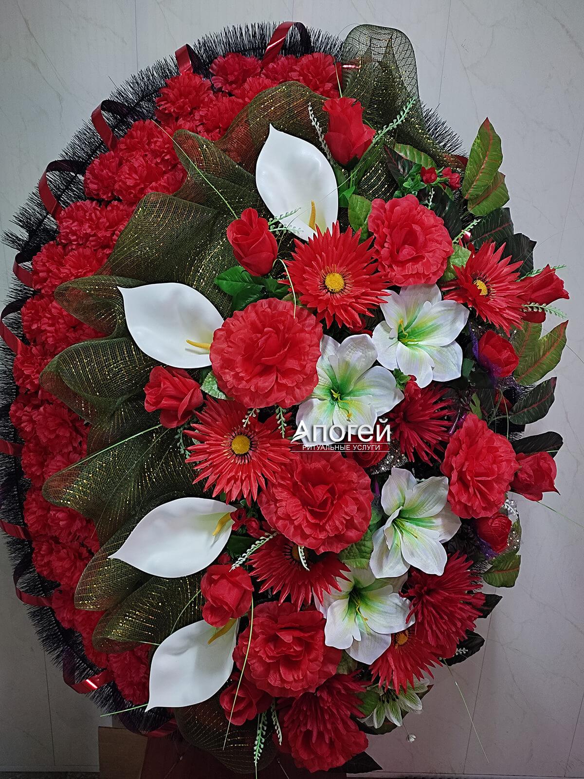 Продажа ритуальных венков. Высота 140 см. Ширина 60 см. Выполнен венок из ярких клематисов, крест-накладка, роза распущенная с зеленью