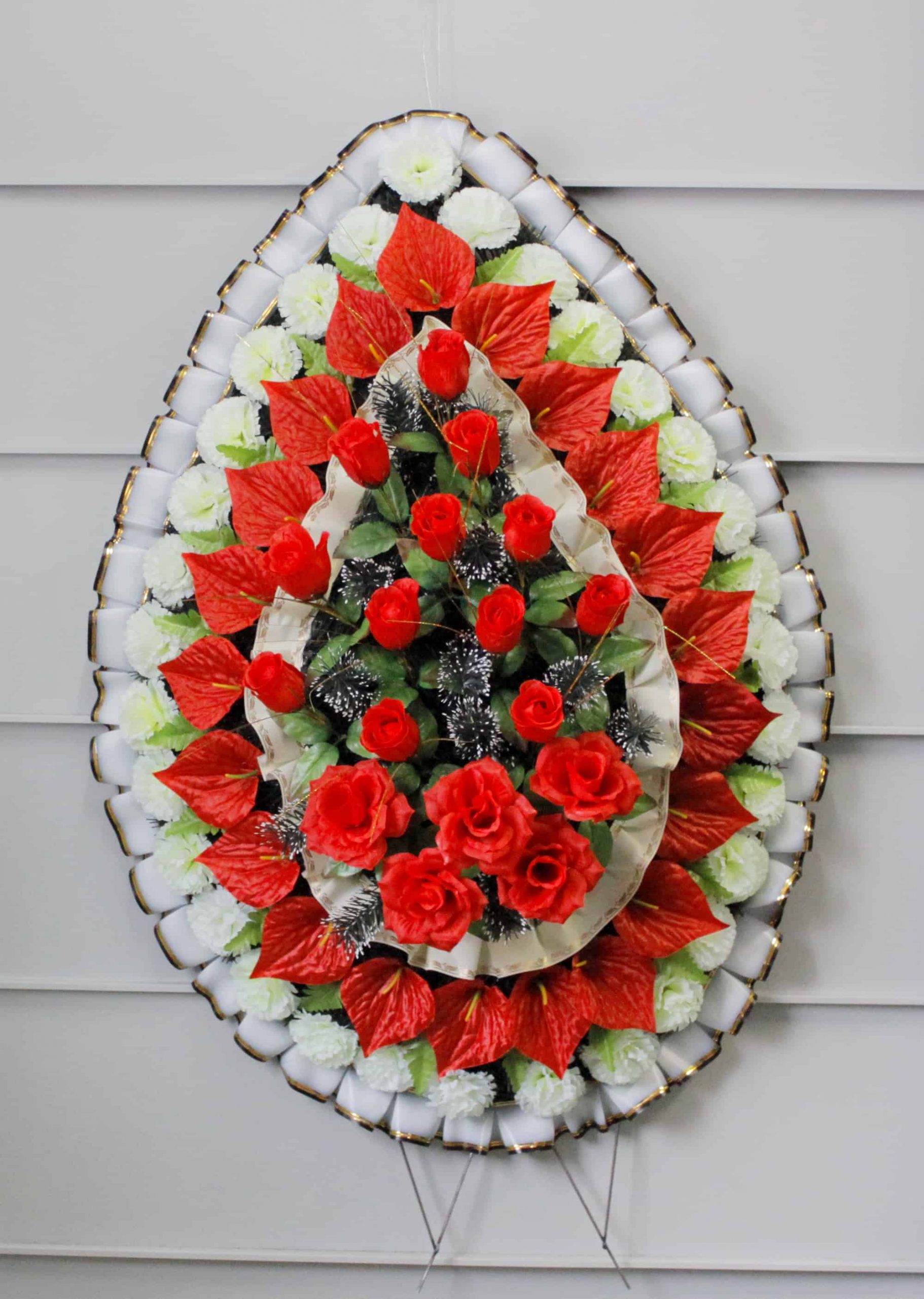 Изготовление ритуальных венков из искусственных цветов. Высота 140 см. Ширина 65 см. Каркас венка оплетен елью