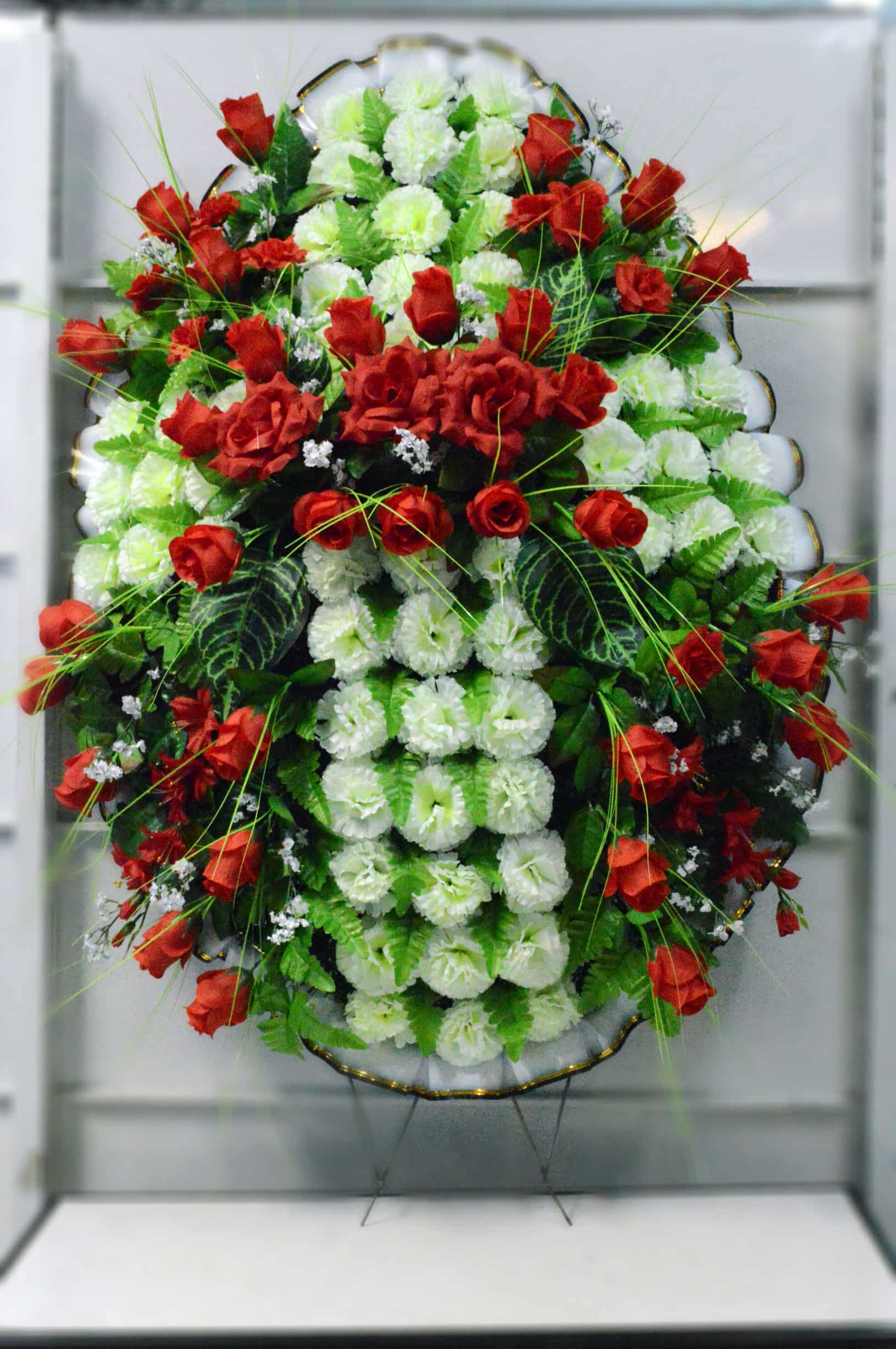 Закажи ритуальный венок с доставкой. Высота 160 см. Ширина 70 см. Состоит из пушистой гвоздики и папоротника. Роза распущенная с зеленью