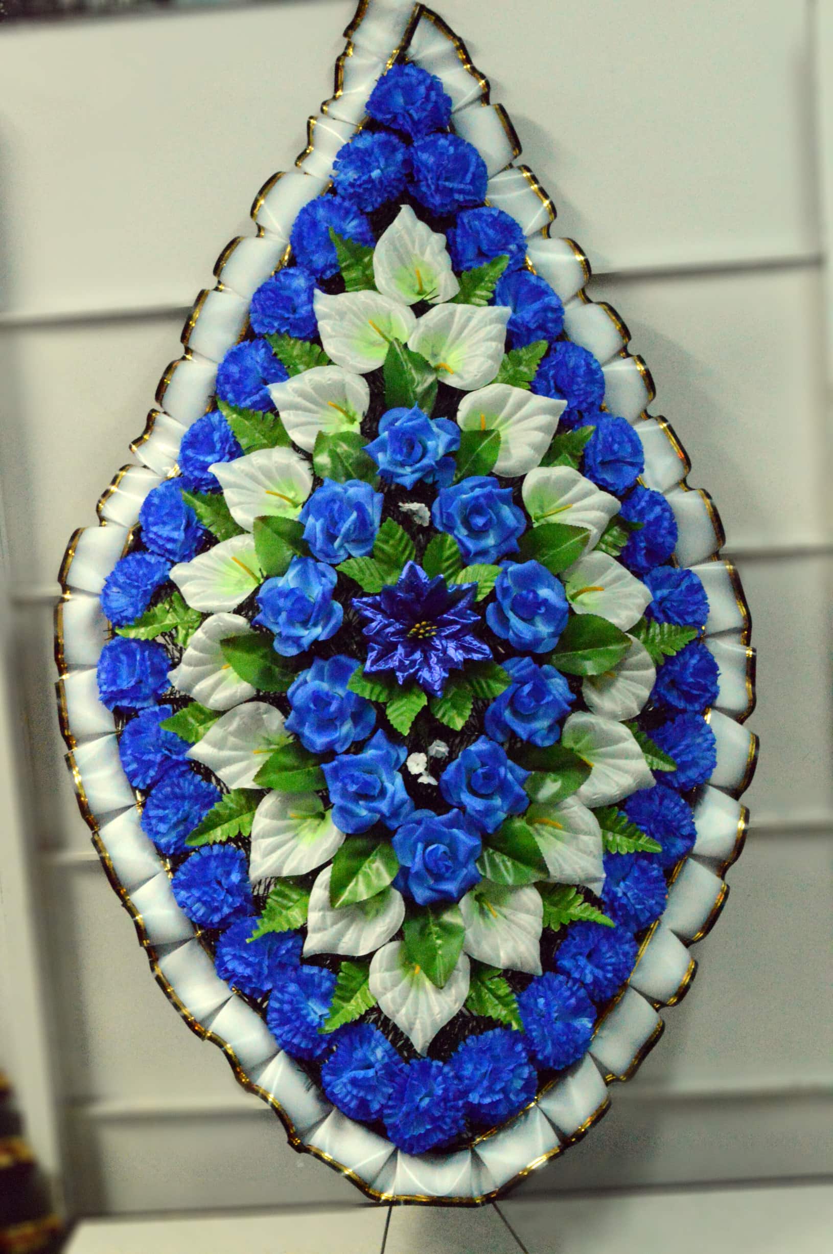 Продажа ритуальных венков. Высота 140 см. Ширина 65 см. Венок состоит: ерш с лентой, желтая гвоздика, папоротник, сиреневый антуриум, роза с зеленью и осокой