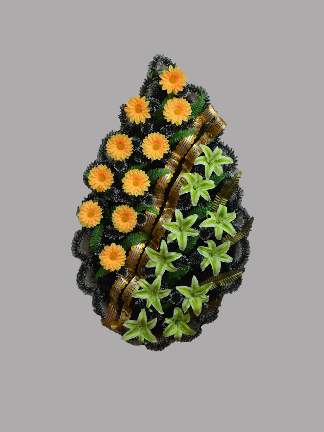 Продажа ритуальных венков по низким ценам. Высота 104 см. Ширина 55 см. Каркас венка оплетен елью