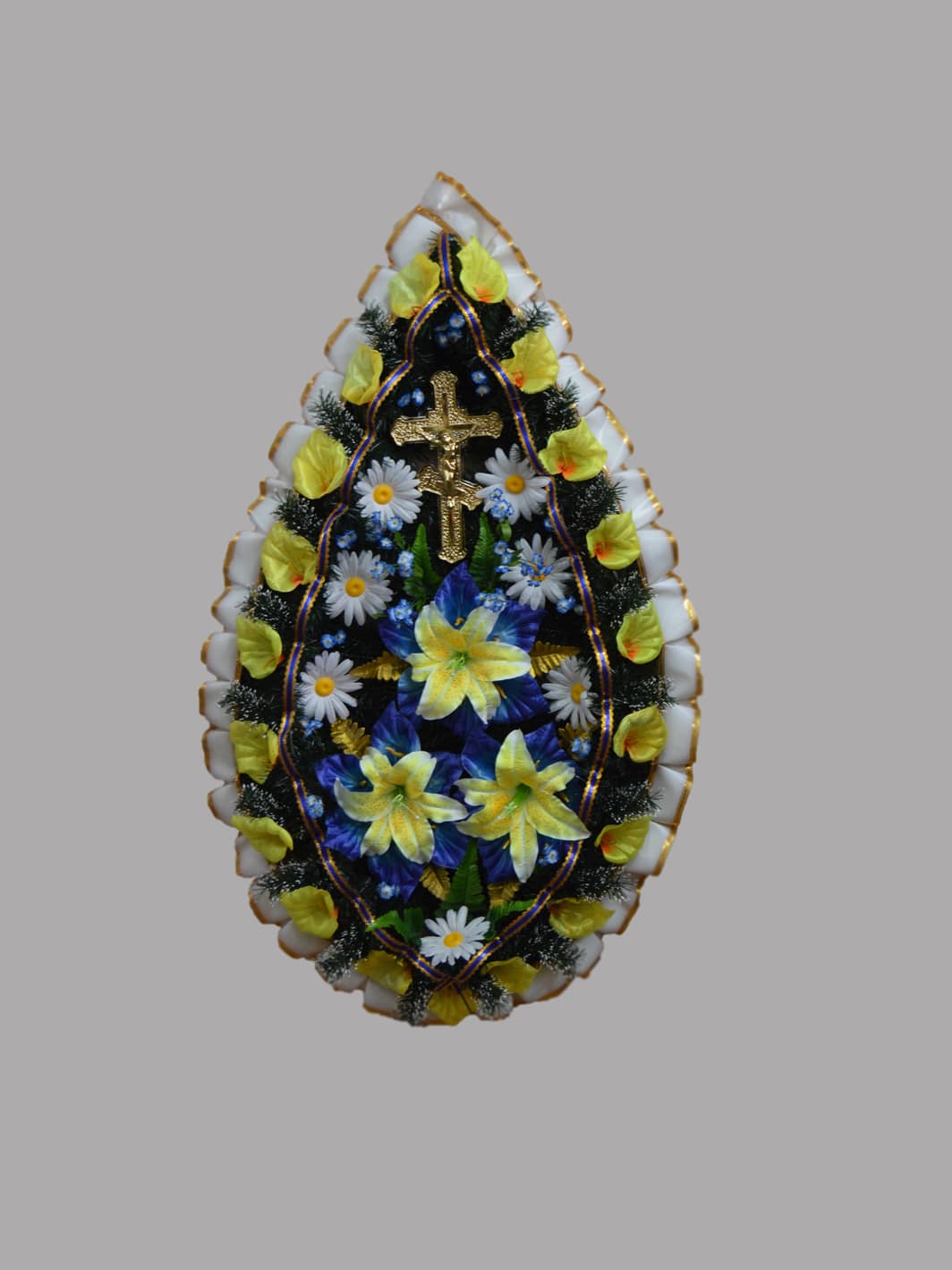 Красивые ритуальные венки. Фото оригинал. Высота 120 см. Ширина 50 см. Яркие клематисы и роза распущенная с зеленью