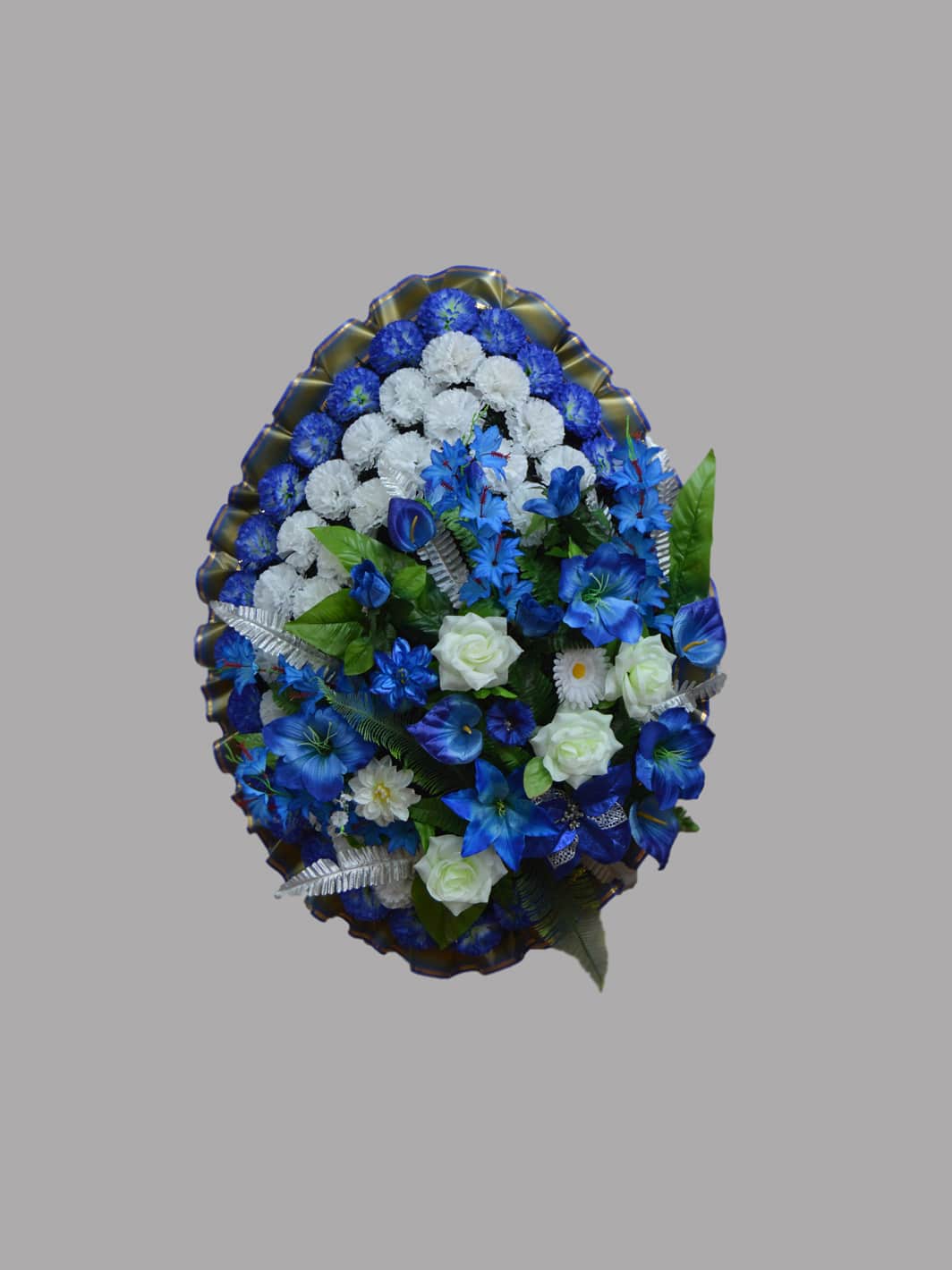 Покупайте траурный венок с доставкой по Минску. Высота 130 см. Ширина 50 см. Каркас венка выполнен из прочного металлического прута на ножках