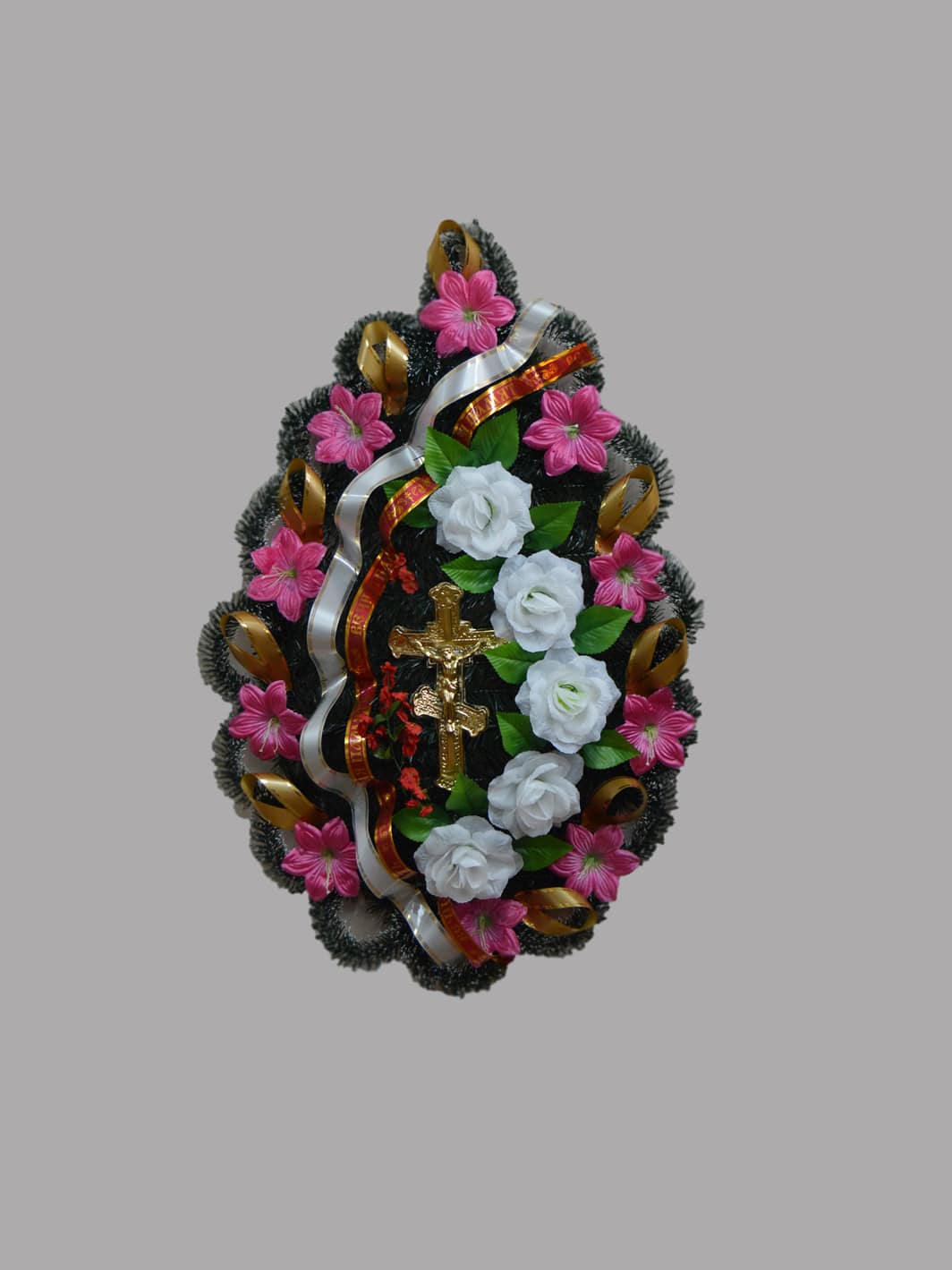 Траурные венки с доставкой. Высота 120 см. Ширина 50 см. Каркас венка выполнен из прочного металлического прута на ножках, которые служат подставкой или креплением к надгробью.