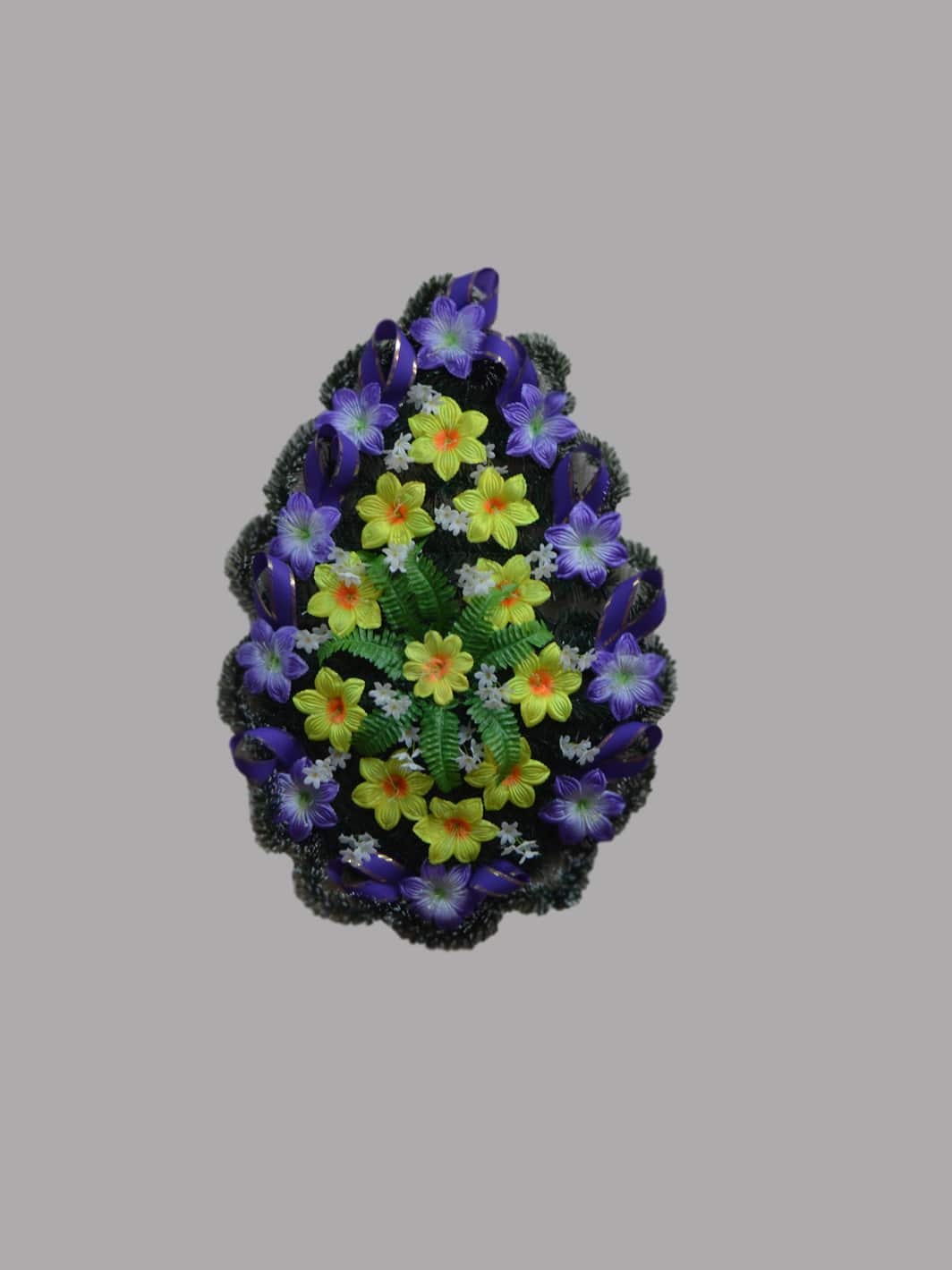 Каталог траурных венков. Высота 130 см. Ширина 55 см. Каркас венка выполнен из прочного металлического прута на ножках, которые служат подставкой или креплением к надгробью.