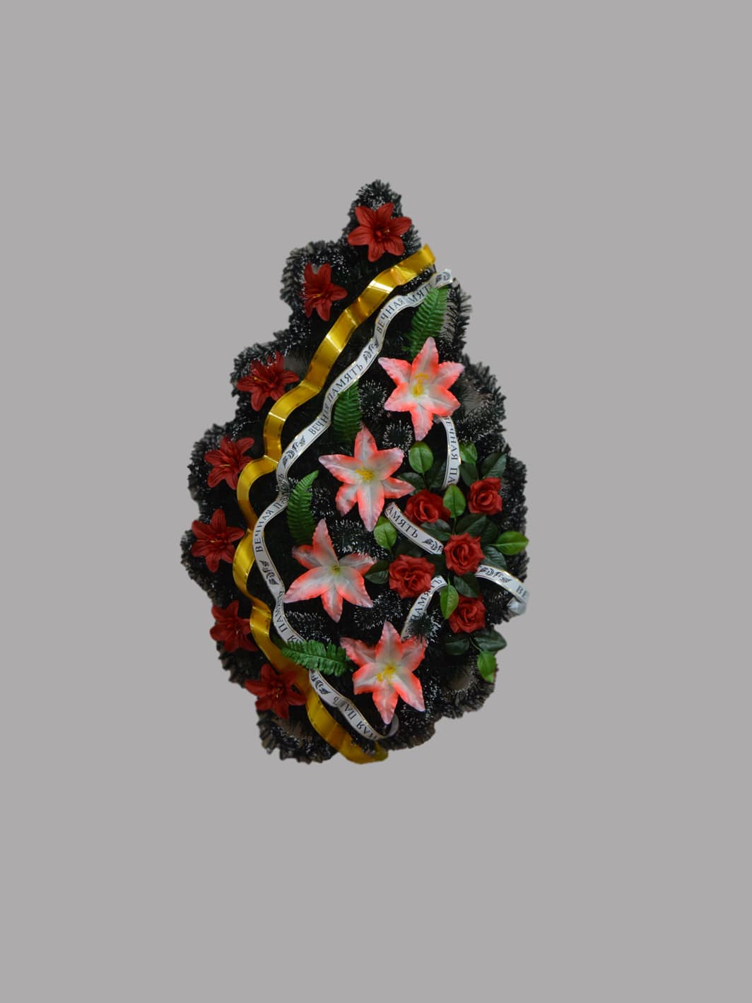 Каталог траурных венков. Высота 130 см. Ширина 55 см. Каркас венка выполнен из прочного металлического прута на ножках, которые служат подставкой или креплением к надгробью.
