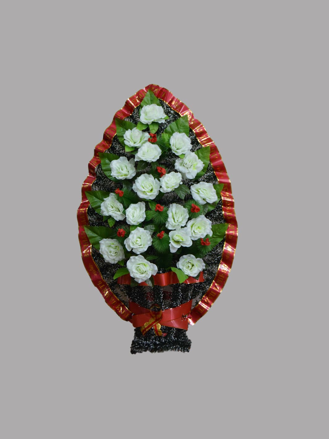 Покупайте траурный венок с доставкой по Минску. Высота 130 см. Ширина 50 см. Каркас венка выполнен из прочного металлического прута на ножках